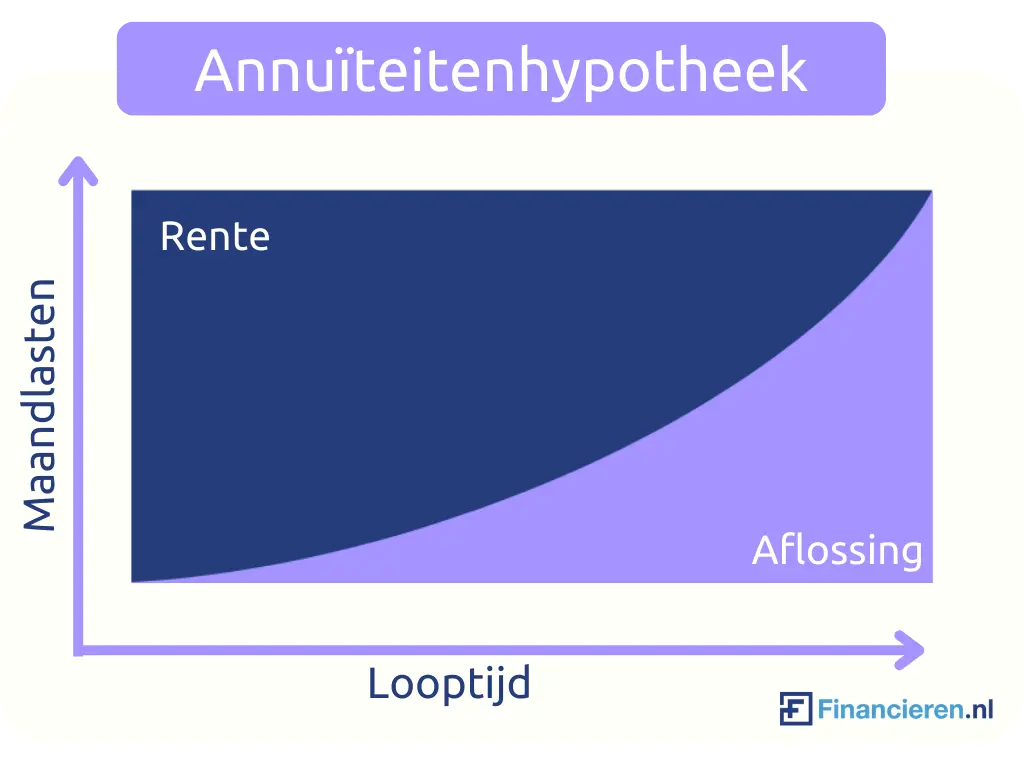 Bij een annuïteitenhypotheek betaal je elke maand een vast bedrag (de zogenaamde annuïteit), bestaande uit rente en aflossing. In het begin betaal je vooral rente en weinig aflossing. Naarmate de tijd vordert, verschuift dit: je betaalt steeds minder rente en juist meer aflossing. Voor beleggers betekent dit dat je maandlasten voorspelbaar zijn, maar dat je minder vrije cashflow overhoudt omdat je altijd aflost.