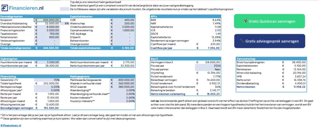 In onze Excel-sheet zijn beide componenten verwerkt, inclusief belastingen, onderhoud, en financieringslasten.